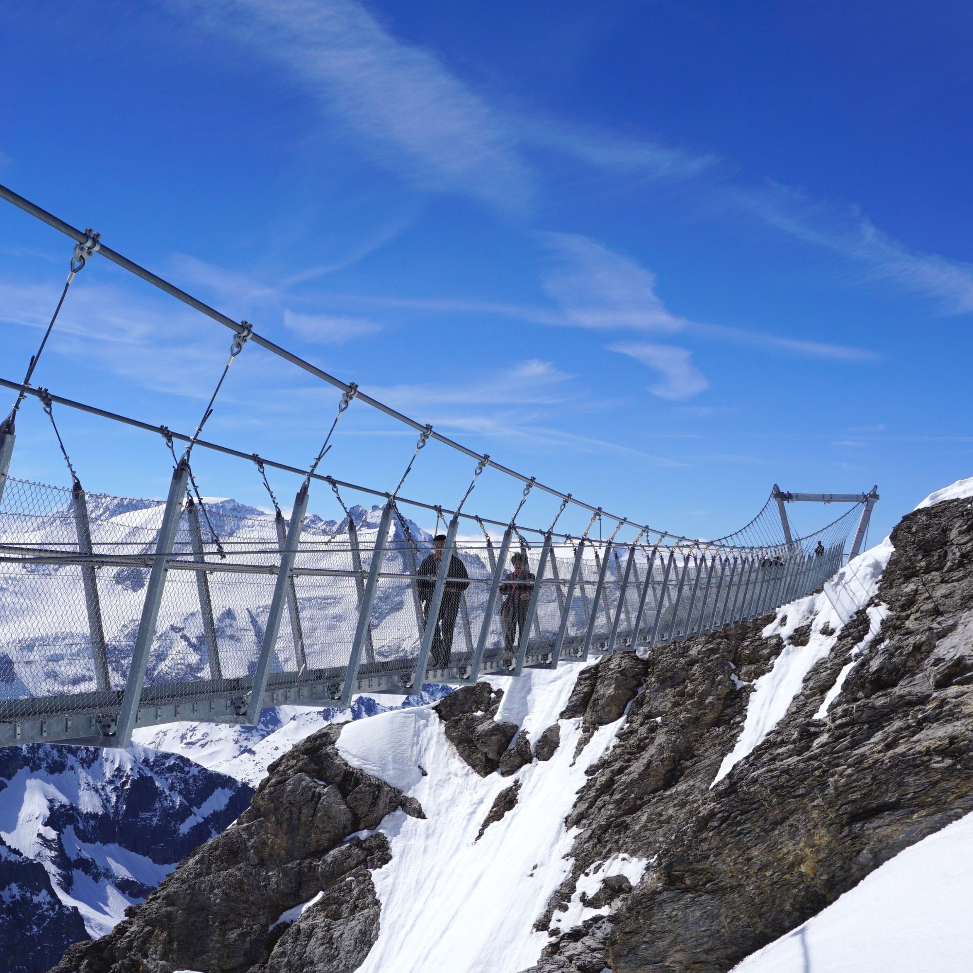 The Titlis Cliff Walk is a suspension bridge in the Swiss Alps. At the height of over 10,000 feet, it's the highest suspension bridge in Europe. Built to commemorate the 100th anniversary of the opening of a cable car, the bridge offers breathtaking views of the surrounding mountains and Italy. However, in bad weather, the bridge can be closed at anytime.
