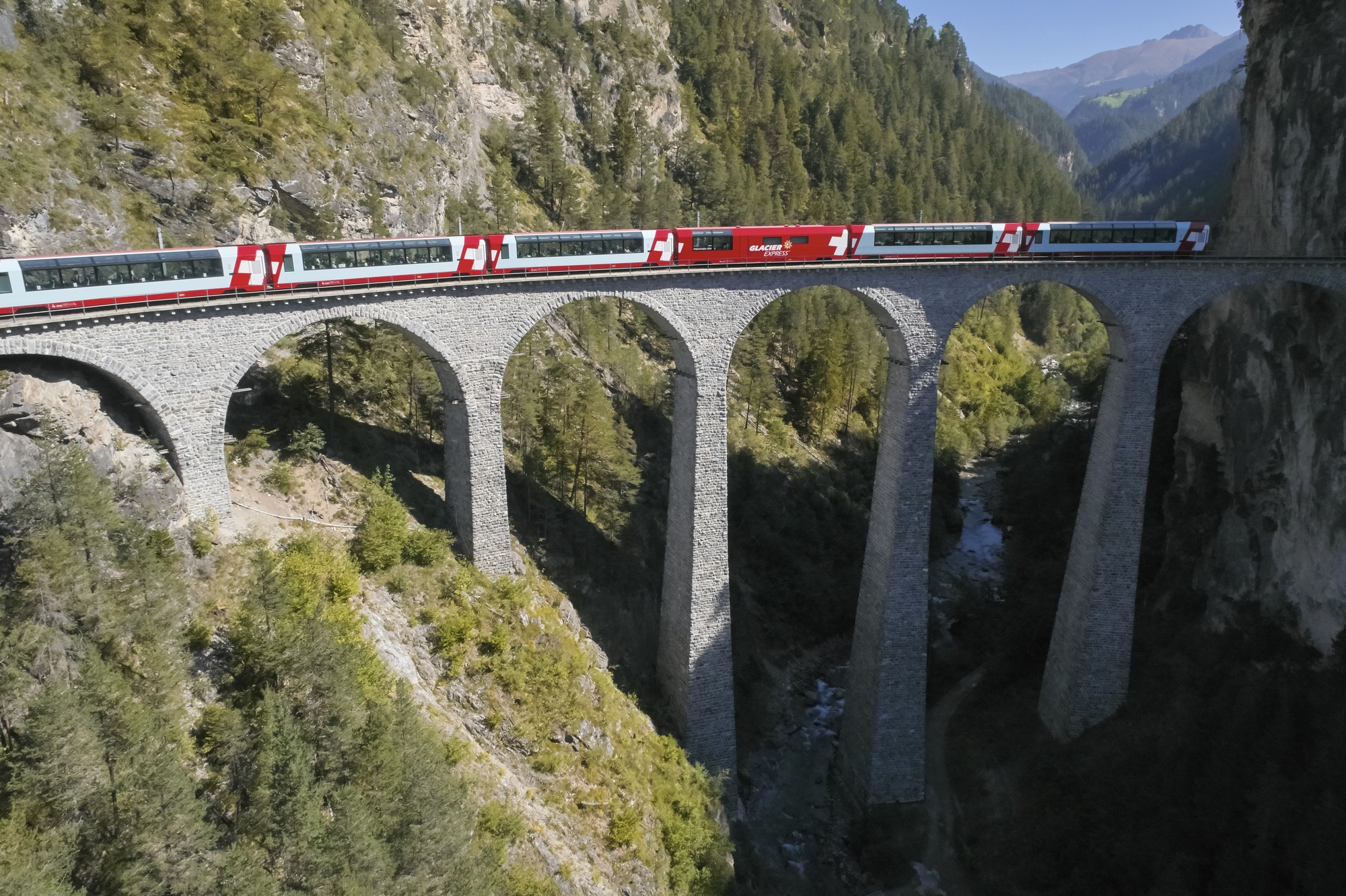 From Thusis, the Glacier Express climbs up the Albula Valley through helical tunnels and over viaducts towards St. Moritz. Harmoniously embedded in the landscape, the Albula line is a monument to the pioneering days of railway-building and is part of the UNESCO World Heritage site Rhaetian Railway in the Albula/Bernina Landscapes.