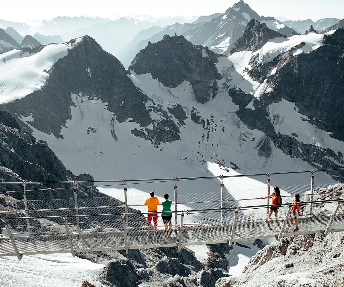 After walking through the Glacier Cave, the route leads you through an underground tunnel and on to a viewing platform. From here the suspension bridge stretches all the way to the Ice Flyer chair lift station. The TITLIS Cliff Walk holds the record for being the highest suspension bridge in Europe.